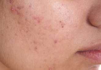 Moderat akne, akne vulgaris, kjennetegnes av papler og pussfylte pustler (kviser, rød hevelse).