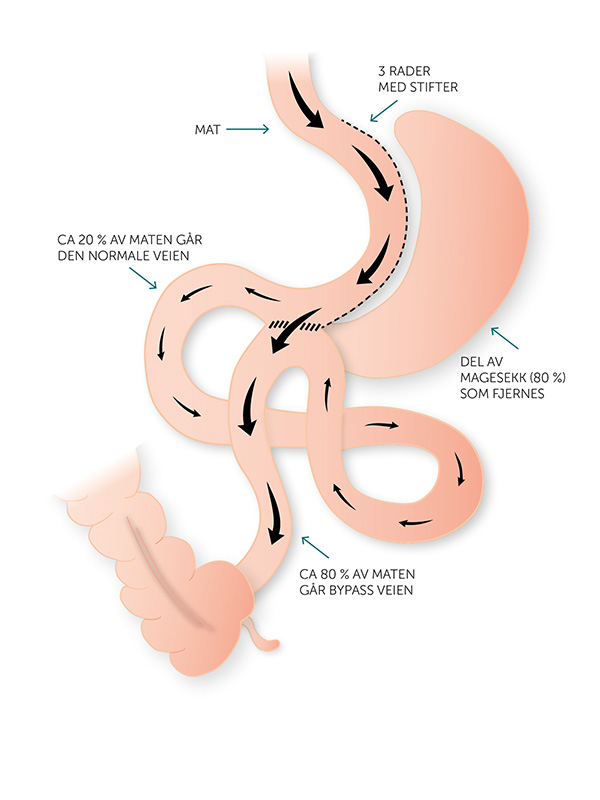 Én løsning er å gjenskape normal anatomi, men dette gir ofte betydelig vektøkning. Et bedre alternativ – som vi ved Aleris har flere års erfaring med – er omkobling til SASI. SASI er ikke en forbikobling av tarmen, men et tilleggskretsløp (bipartition).
